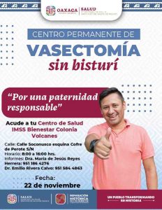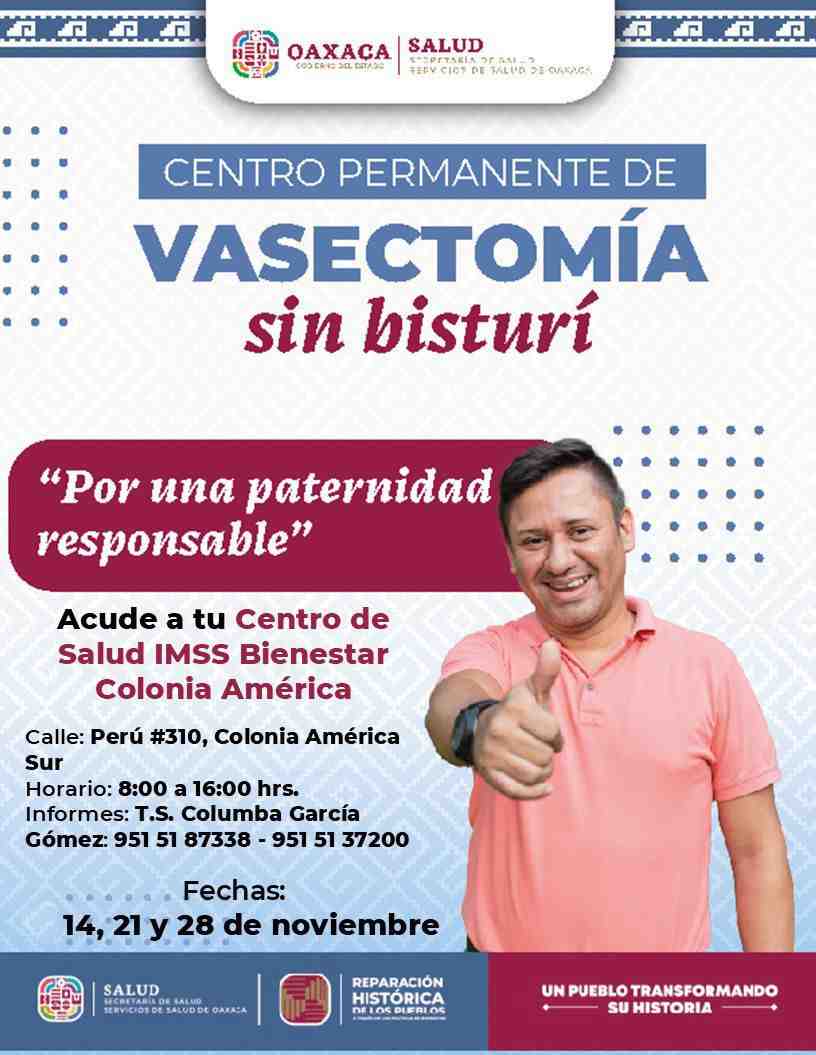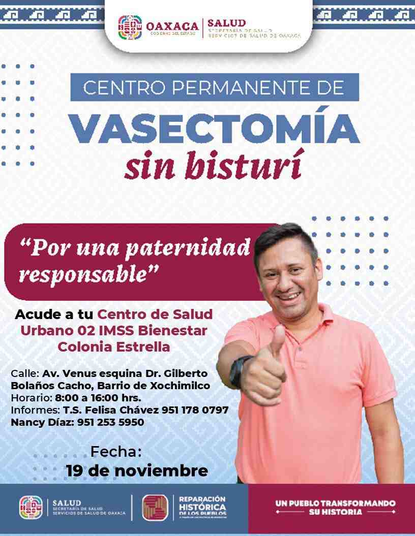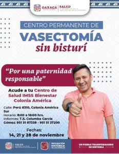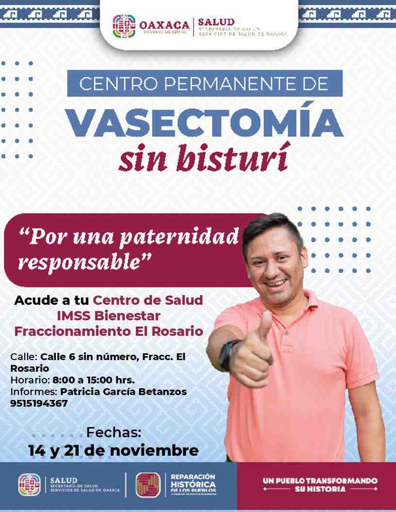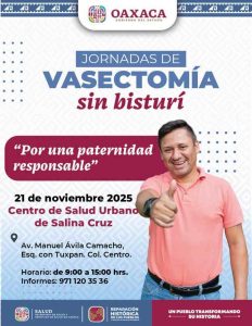 Con el objetivo de promover paternidades responsables y decisiones informadas en materia de salud sexual y reproductiva, los Servicios de Salud de Oaxaca (SSO) anunciaron la Jornada Gratuita de Vasectomía sin Bisturí, que se llevará a cabo los días 19, 21, 22 y 28 de noviembre en unidades médicas de IMSS-Bienestar ubicadas en las Jurisdicciones Sanitarias 1 Valles Centrales y 2 Istmo.