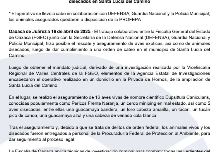 **La Fiscalía de Oaxaca decomisó animales protegidos y maltratados en un domicilio tras una investigación regional.